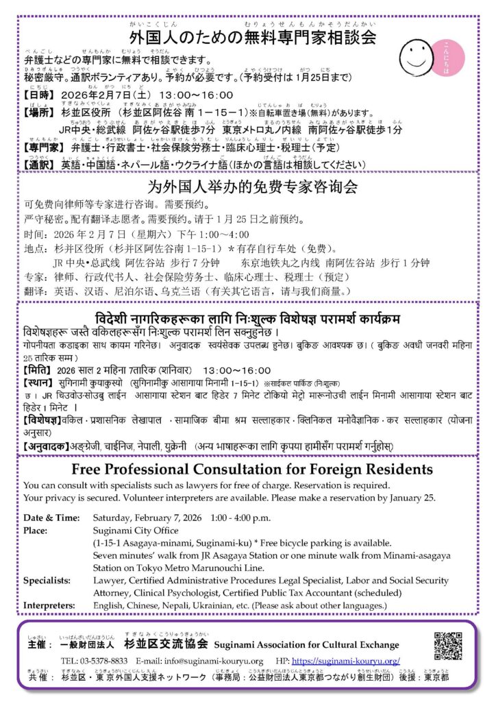 「外国人のための無料専門家相談会」(杉並区交流協会主催)のお知らせ